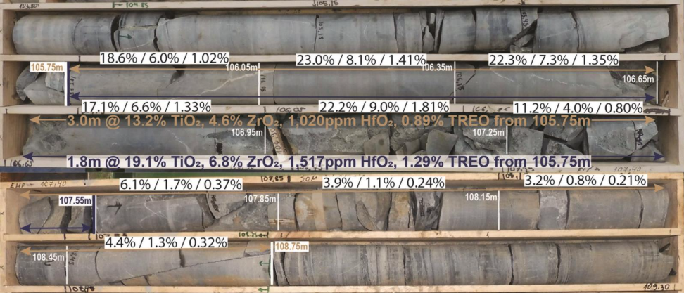 Diamond drill core photos and assay data (Black: TiO2% / ZrO2% / TREO% grades; Brown: 3% TiO2% cut-off weighted average grade; Blue: 8% TiO2% cut-off weighted average grade).